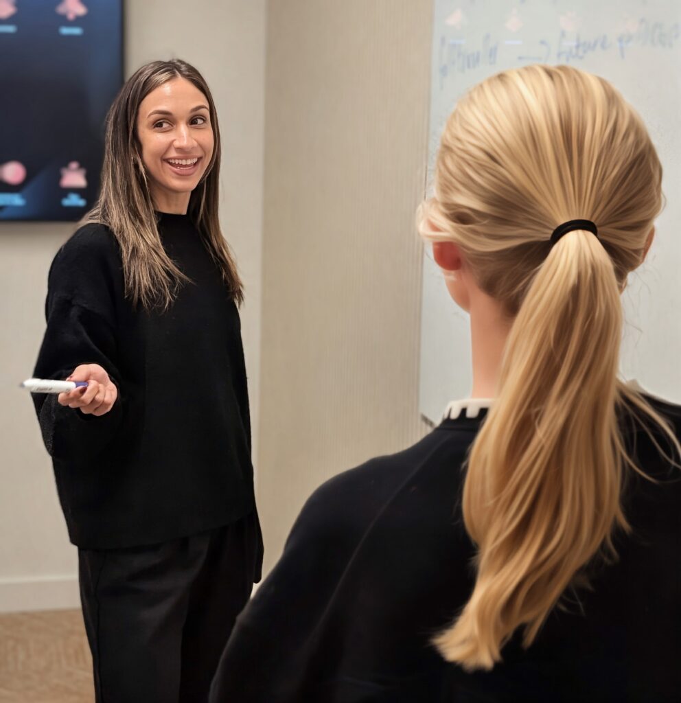 Finally, we find Ashley Thorne (pictured), Account Executive, in the middle of a deal workshop. Ashley’s coffee order? Flat White with Oat Milk. She’s dissecting outreach techniques with a newer rep. For Ashley, “Give to Gain” is about the immediate impact of mentorship.